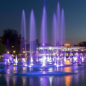 След падането на мрака фонтаните се осветяват, зазвучава музика и в ритъм с нея водните струи и цветовете се променят.
